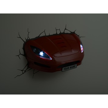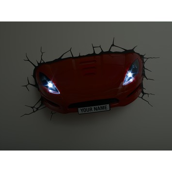 De 3D sportauto is een unieke lamp, het lijkt net of er echt een rode sportauto door de muur is gecrashed. De lamp is voorzien van twee LED lichten (die niet warm worden) die in de koplampen van de auto verwerkt zijn. Bovendien is het kentekenbord te personaliseren dankzij de meegeleverde letterstickers. De lamp wordt daarnaast geleverd met een wandsticker, waardoor het net lijkt of de muur ook beschadigd is door de crash.