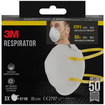 Het 3M™ Stofmasker voor handmatig schuren 8710E is een gelaatsmasker met filter met een robuuste vormvaste schaal, een verstelbare neusbeugel en kleurgecodeerde hoofdbanden voor comfortabele bescherming. Het is FFP1-geclassificeerd en verkrijgbaar in een verpakking van 3 stuks.