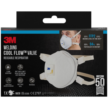 Het 3M™ Stofmasker voor lassen 9928 is ons FFP2-geclassificeerde gelaatsmasker met filter dat is voorzien van een zachte gelaatsafdichting, verstelbare neusbeugel en verstelbare hoofdbanden.
