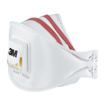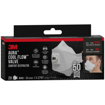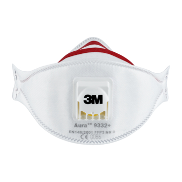 Het 3M™ Aura™ Stofmasker voor isolatiemateriaal en hardhout 9332+ is ons gelaatsmasker met filter dat is voorzien van het Aura™ ontwerp met 3 panelen, een verstelbare neusbeugel, een voorgevormd neuspaneel, kleurgecodeerde rode hoofdbanden en het 3M™ Cool Flow™ uitademventiel voor comfortabel dragen. Het is FFP3-geclassificeerd en verkrijgbaar in een verpakking van 2 stuks.