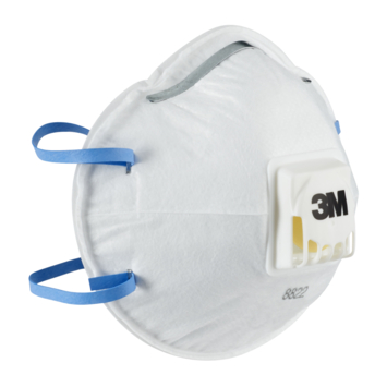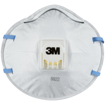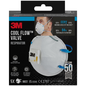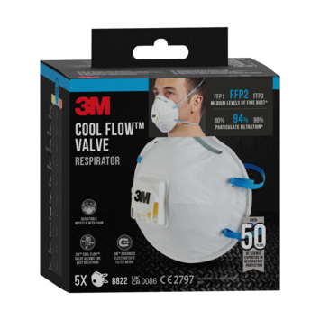 Het 3M Stofmasker voor handmatig en machinaal schuren 8822 is een geventileerd gelaatsmasker met filter dat is voorzien van een verstelbare neusbeugel, kleurgecodeerde hoofdbanden en het 3M™ Cool Flow™ uitademventiel voor comfortabel dragen. Het is FFP2-geclassificeerd en verkrijgbaar in een verpakking van 5 stuks.