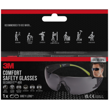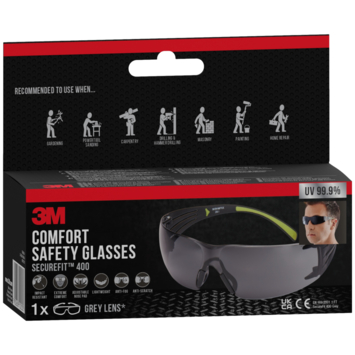 3M™ SecureFit™ 400 veiligheidsbrillen zijn onze wraparound veiligheidsbrillen met een grijs getinte, sterke, krasbestendige polycarbonaatlens. De brilveren hebben zachte uiteinden over de oren en de zachte instelbare neuskussentjes zorgen voor een comfortabele pasvorm. Het lichtgewicht ontwerp weegt slechts 19 g en heeft opvallende neongroene brilveren zodat de bril een echte blikvanger is.