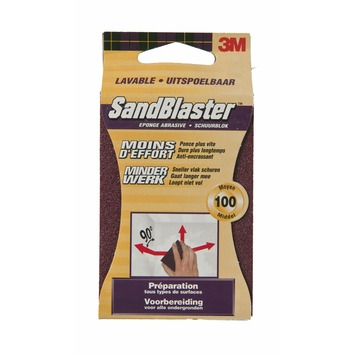 De 3M™ SandBlaster™ schuurspons p100 paars is een schuurspons met grofheid 100. De spons heeft een afmeting van 66 bij 95 millimeter. Grofheid 100 is een medium grofheid en geschikt voor het verwijderen van oneffenheden op houten, metalen of stuc- en pleister ondergronden. Voordeel van een spons ten opzichte van schuurpapier is dat deze uitwasbaar is, ook nat gebruikt kan worden en ook op gebogen en gekromde oppervlakten goed overal bijkomt. Zo maak je op een snelle manier het oppervlak klaar voor de verf- of laklaag.