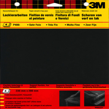 De 3M™ Wetordry™ schuurpapier p240 4 stuks zijn vier vellen fijn schuurpapier voor lichte verf- en lakverwijdering tussen twee verflagen om een goede hechting te verzekeren. Het schuurpapier is watervast en kan dus ook voor nat schuren gebruikt worden. Het schuurpapier heeft een afmeting van 23 bij 28 centimeter en is ook op kunststof en polyester te gebruiken.