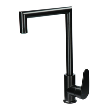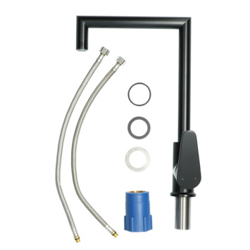 <b>Comfort</b></br>De Absolut Fasso éénhendel keukenkraan Zwart is een echte eye-catcher in de keuken met de hoge en hoekige uitloop. Met het strakke design en de mat zwarte afwerking oogt het robuust en is het een must-have in de landelijke of industriële keuken. Mocht een andere kleur beter passen in het interieur, dan is er ook een chromen of grafieten variant te kopen bij Karwei.<p>De hoogte van maar liefst 48 cm zorgt voor veel ruimte in de gootsteen. Dat is praktisch bij het vullen van een grote pan of een emmer. Bovendien is de kraanuitloop 360° te draaien, wat extra bewegingsvrijheid geeft op het aanrecht. Zo is bijvoorbeeld een grote gevulde pan makkelijk uit de gootsteen te tillen door de kraan weg te draaien.</p><p>Met de eenhendelbediening meng je eenvoudig met 1 hand vooraf het water naar de gewenste temperatuur.</p><p>Het onderhoud van de kraan is eenvoudig: kalk is eenvoudig met de vingers van de uitloop af te vegen, doordat vuil en kalk zich niet makkelijk hecht aan de siliconen noppen in de sproeikop. De keramische schijven maken niet alleen de bediening van de kraan soepel en nauwkeurig, ze vergen vooral weinig onderhoud en gaan langer mee dan kranen met een traditioneel binnenwerk.</p><p><b>Besparing</b></br>In de sproeikop is een waterbespaarder geïntegreerd, wat goed is voor het milieu en de portemonnee!</p><p><b>Garantie & montage</b></br>Met de meegeleverde flexibele aansluitslangen en bevestigingsmateriaal is de keukenkraan makkelijk te installeren door het vereenvoudigde montagesysteem. Bij aankoop is 5 jaar fabrieksgarantie inbegrepen.