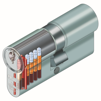 De 2 sterren SKG cilinder van ABUS heeft een gevarenfunctie: aan de buitenzijde bedienbaar als aan de binnenzijde een sleutel in steekt. De cilinder heeft 6 sluitstiften per zijde en een goede boorbeveiliging: 8 hardstalen elementen per zijde. Geleverd met 3 sleutels met langere hals t.b.v. dikte van veiligheidsbeslag.