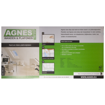 De Agnes plafondplaat wit linnen is een plaat die voorzien is van een witte decorfolie met een linnen motief. De Agnes plafondplaten hebben een afmeting van 120 x 60 cm en zijn eenvoudig te bevestigen met spijkers, schroefjes of nieten, waarbij de kop van de bevestiging niet in het basismateriaal mag doordringen. De platen zijn zeer geschikt voor het afwerken van bijvoorbeeld de schuine kap van de zolder.