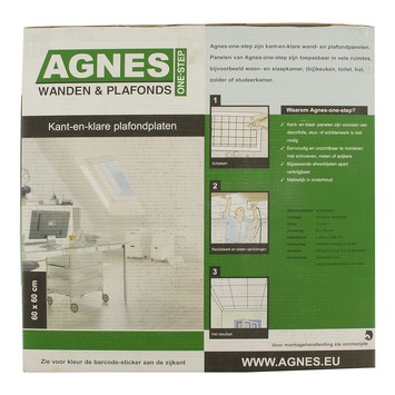 De Agnes plafondplaat wit stuc is een plaat die voorzien is van een witte decorfolie met een licht stuc motief (fijn spacwerk). De Agnes plafondplaten hebben een afmeting van 60 x 60 cm en zijn eenvoudig te bevestigen met spijkers, schroefjes of nieten, waarbij de kop van de bevestiging niet in het basismateriaal mag doordringen. De platen zijn zeer geschikt voor het afwerken van bijvoorbeeld de schuine kap van de zolder.