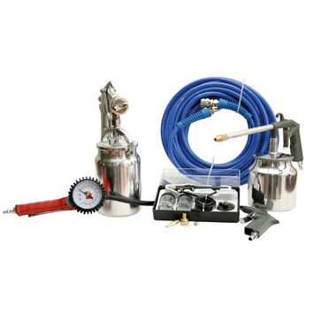 De Airpress compressor accessoireset is ideaal als startset bij de aanschaf van een compressor. Deze 9-delige persluchtgereedschapset bestaat uit een verfspuit met onderbreker, een blaaspistool, vloeistofspuit, airbrushspuit en een bandenvulmeter. uit een spiraalslang van 5 meter, een verfspuit met onderbeker, een blaaspistool, een bandenpomp en drie pompnippels.