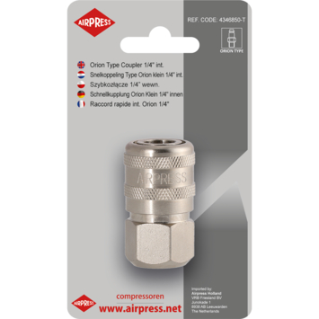 De Airpress snelkoppeling 1/4" inwendig is gemaakt van hoogwaardig metaal. De kwaliteitskoppeling, type Orion, heeft een 1/4 inch inwendig schroefdraad en een ruime luchtdoorlaat.