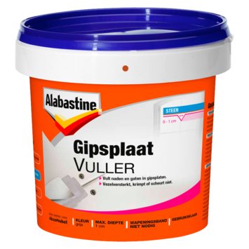 Alabastine Gipsplaat Vuller is kant en klaar voor gebruik. Deze vuller is vezelversterkt en daardoor ontstaan er geen scheurtjes of krimp in de naden die u heeft aangebracht. Door de vezel kan deze Gipsplaatvuller licht ondergrondwerking opvangen en is er geen wapeningsband nodig. Deze vuller kan ook gebruikt worden voor het vullen van de schroefgaten. Na droging geeft Gipsplaatvuller een perfecte gladde ondergrond om te schilderen of te behangen.