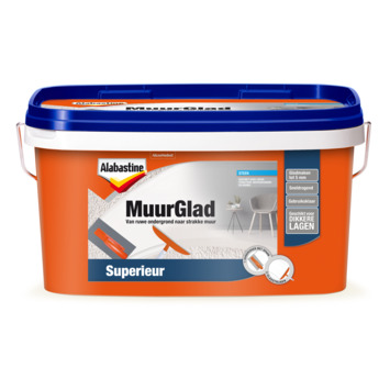 Met Muurglad Superieur kan je beschadigingen tot 5mm in één laag repareren en egaliseren. Ook is het mogelijk om een structuurwand makkelijk glad te maken met deze egaliseerpasta. Voor deze klus is er een eenvoudig te gebruiken gereedschapset ontwikkeld, de Alabastine Spaan en Strijker.