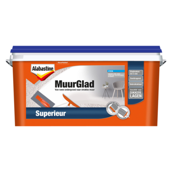 Met Muurglad Superieur kan je beschadigingen tot 5mm in één laag repareren en egaliseren. Ook is het mogelijk om een structuurwand makkelijk glad te maken met deze egaliseerpasta. Voor deze klus is er een eenvoudig te gebruiken gereedschapset ontwikkeld, de Alabastine Spaan en Strijker.
