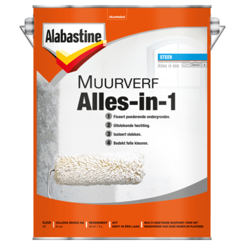 Alabastine Alles-in-1 voorkomt afbladderen en loslaten van verf en bedekt blijvend alle hardnekkige vlekken. De verf is ideaal voor het renoveren van oude muren en plafonds en is te gebruiken op poederende lagen, dunne lagen veegvast en witkalk, oude muurverflagen en oude ondergronden. De Alabastine Alles-in-1 dekt in 1 laag en heeft een helder witte matte kleur. De muurverrf is gebruiksklaar en hoeft niet meer verdund te worden. De inhoudsmaat is 5 liter.