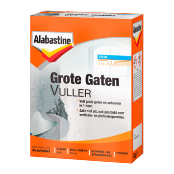 Grote gaten vullen een lastige klus? Niet met deze stevige Grote Gatenvuller van Alabastine. Dit poeder product is makkelijk te mengen. Als je grote gaten in o.a. steen en beton wilt vullen, is Alabastine Grote Gaten Vuller het ideale product voor jou. Deze grote gaten vuller zakt niet uit, is voor binnen en buiten geschikt en is bovendien schuur-, spijker- en schroefbaar.