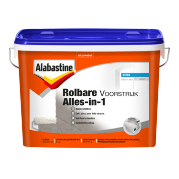 De Alabastine Rolbare Voorstrijk Alles in 1 5 l geeft een witte basislaag voor een betere dekking van de eindlaag. Deze voorstrijk heft niet alleen de zuigende werking van de ondergrond op, maar geeft ook een permanente dekking van haarscheurtjes door de flexibele, scheur overbruggende formule. Daarnaast bedekt de voorstrijk blijvend de meeste vlekken door de isolerende werking en worden (felle) kleuren bedekt door het uitstekend dekkend vermogen. Dit werkt het beste op steenachtige ondergronden. Je kunt deze voorstrijk snel en schoon zonder spetters met een roller aanbrengen. De Alabastine Rolbare Voorstrijk Alles in 1 5 l geeft de ideale basislaag voor een mooi schilder resultaat.