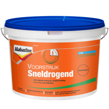 Alabastine voorstrijk sneldrogend transparant is een voorbehandelingsmiddel voor latex, sierpleister, muur- en structuurverf. Al na 3 uur overschilderbaar. Te gebruiken op o.a. pleister- en stucwerk, spuitwerk (spack), gipsplaten, steen, beton en nieuwbouwmuren. Maar ook handig voor de behangklus! Geschikt voor binnen en buiten. Inhoudsmaat 2,5 liter is voldoende voor een oppervlakte van ca 25 m².