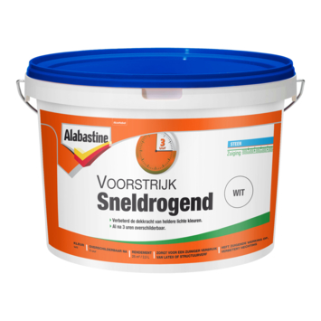 Alabastine voorstrijk sneldrogend wit is een voorbehandelingsmiddel voor latex, sierpleister, muur- en structuurverf. Al na 3 uur overschilderbaar. Te gebruiken op o.a. pleister- en stucwerk, spuitwerk (spack), gipsplaten, steen, beton en nieuwbouwmuren. Geschikt voor binnen en buiten. Voor gebruik ondergrond testen of voorstrijken noodzakelijk is. Ondergrond vochtig maken met water (bv. met spons of plantenspuit). Alleen indien het vocht nagenoeg volledig wordt opgenomen is voorstrijken noodzakelijk. Ondergrond moet schoon, droog, stof- en vetvrij zijn. Opslag en gebruik niet beneden 10°C. Inhoudsmaat 2,5 liter is voldoende voor een oppervlakte van ca 25 m².