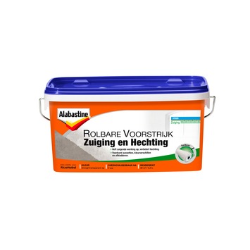 De Alabastine zuiging en hechting rolbare voorstrijk 2,5 l biedt optimale hechting en kan snel en schoon (zonder spetters) met een roller worden aangebracht. Deze voorstrijk heft de zuigende werking van de ondergrond op zorgt voor een zuiniger verbruik van muur- of structuurverf. Daarnaast voorkomt deze voorstrijk aanzetten en kleurverschillen en zorgt voor een betere en egalere dekking van de verf. Na 4 uur is de voorstrijk overschilderbaar met alle soorten verf. De Alabastine zuiging en hechting rolbare voorstrijk 2,5 l droogt transparant op.