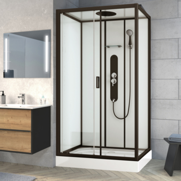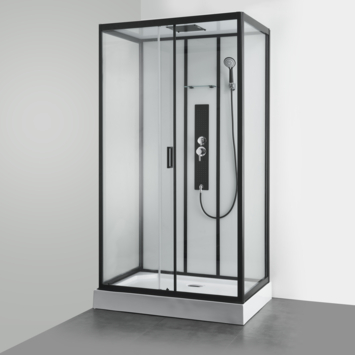Met de complete douchecabine Uyuni van Allibert heb je alles in één keer geregeld voor een ontspannende douche. Geen gedoe meer! De extra ruime douchecel van 80 x 120 cm heeft een moderne en minimalistische uitstraling. De achterwanden zijn van wit veiligheidsglas en het geheel is afgewerkt met strakke matzwarte aluminium profielen. Doe je ogen dicht en ben even op vakantie in je eigen huis. Met een ruime hoofddouche, hydromassagestralen en een verstelbare handdouche in 3 standen, kun je jouw douche-ervaring volledig aanpassen naar jouw wensen. De handige schuifdeur bespaart ruimte en is ideaal voor mensen met een kleinere badkamer die toch van maximaal douchecomfort willen genieten. De antislipvoorziening op de vloer voorkomt uitglijden, terwijl de coating op het glas tegen vuil en kalkaanslag beschermt. Zo maak je de wanden makkelijk schoon en blijft jouw douchecabine er als nieuw uitzien.
