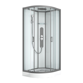 Met de complete douchecabine Uyuni van Allibert heb je alles in één keer geregeld voor een ontspannende douche. Geen gedoe meer! De kwartronde cabine van 90 x 90 cm heeft een moderne en minimalistische uitstraling. De achterwanden zijn van wit veiligheidsglas en het profiel is vervaardigd uit verchroomd aluminium. Met een hoofddouche in het plafond, hydromassagestralen en een verstelbare handdouche in 3 standen, kun je jouw douche-ervaring volledig aanpassen naar jouw wensen. De dubbele schuifdeur bespaart ruimte en is ideaal voor mensen met een kleinere badkamer die toch van maximaal douchecomfort willen genieten. De antislipvoorziening op de vloer voorkomt uitglijden, terwijl de coating op het glas tegen vuil en kalkaanslag beschermt. Zo maak je de wanden makkelijk schoon en blijft jouw douchecabine er als nieuw uitzien.