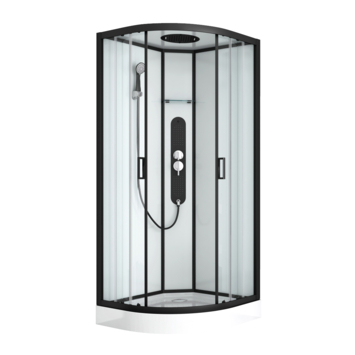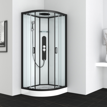 Met de complete douchecabine Uyuni van Allibert heb je alles in één keer geregeld voor een ontspannende douche. Geen gedoe meer! De kwartronde cabine van 90 x 90 cm heeft een moderne en minimalistische uitstraling. De achterwanden zijn van wit veiligheidsglas en het geheel is afgewerkt met strakke matzwarte aluminium profielen. Doe je ogen dicht en ben even op vakantie in je eigen huis. Met een ruime hoofddouche, hydromassagestralen en een verstelbare handdouche in 3 standen, kun je jouw douche-ervaring volledig aanpassen naar jouw wensen. De dubbele schuifdeur bespaart ruimte en is ideaal voor mensen met een kleinere badkamer die toch van maximaal douchecomfort willen genieten. De antislipvoorziening op de vloer voorkomt uitglijden, terwijl de coating op het glas tegen vuil en kalkaanslag beschermt. Zo maak je de wanden makkelijk schoon en blijft jouw douchecabine er als nieuw uitzien.