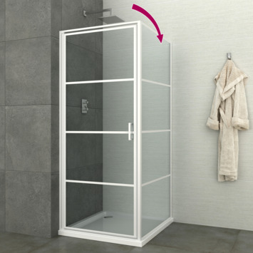 Op zoek naar een nieuwe moderne douchewand? Deze wand voor de douche is een perfecte aanvulling op een robuust en industrieel interieur van de badkamer. Het doorzichtige glas met witte strepen is afgewerkt met mat wit gelakte aluminium profielen. De strepen en lijnen van de profielen geven een strakke uitstraling aan de douche. Het glas is voorzien van een speciale coating, zodat zeep en kalk geen kans krijgen een aanslag te vormen. Het glas blijft daardoor langer helder en het maakt de reiniging ervan eenvoudig.