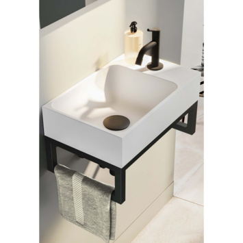 Met de praktische Allibert fontein Iron Pack maak je je stijlvolle toiletruimte af. De fonteinset is stijlvol met zijn mat witte wastafel die aansluit op het zwarte metalen frame. Het zwarte metalen frame heeft een praktische functie als handdoekrek. Er is aan beide zijden de wastafel plaats om een handdoek te hangen. De fontein is 25,2x40,2x21cm groot en wordt geleverd inclusief bevestigingsmateriaal. De kraan en sifon worden niet meegeleverd waardoor je een bijpassende kraan naar keuze kan uitzoeken. De Allibert fontein Iron Pack heeft 2 jaar garantie.