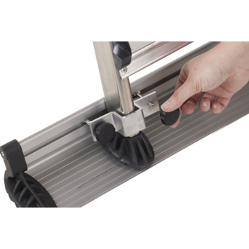 Geschikt voor alle huishoudtrappen Gardenbase. Dé handige accessoire voor werken op zand, gras en grind. Voor alle werkzaamheden in de tuin werk je natuurlijk het liefst met een huishoudtrap. Niets is vervelender als je bij het knippen van de heg jouw huishoudtrap nét niet goed neer kunt zetten, omdat je gedeeltelijk of in zijn geheel op een zachte ondergrond werkt. Met de Gardenbase onder jouw huishoudtrap wordt werken op zand, gras of grind een koud kunstje. De 90 centimeter brede Gardenbase bevestig je gemakkelijk aan de onderzijde van jouw huishoudtrap door de meegeleverde U-beugel en draaiknoppen. Zo staan de voeten van de trap altijd op een vlakke en stevige ondergrond. Door de geanodiseerde afwerking (een harde en slijtvaste laag) blijft het materiaal van jouw Gardenbase ook nog eens langer mooi.