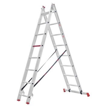 Een trap die je als schuifladder tegen je huis kunt zetten én als A-ladder kunt gebruiken, dat is de Altrex Reformladder All Round 2 x 8 Treeds. Deze ladder is gemaakt van aluminium en daarom licht van gewicht (8.3 kg), je verplaatst hem dus met gemak. Door zijn speciale vorm zit de D-sport stevig in het frame en biedt het je dankzij zijn diepte van 32 mm een breed sta-oppervlak. Je herkent een echte Altrex aan zijn rode sport, die je precies aangeeft tot op welke hoogte je nog verantwoord kan werken. Dankzij de opsteekhaak met veiligheidspal schuift de trap niet zomaar in, wel zo veilig. De maximale draagkracht is 150 kg. Kortom: een goede keuze voor zowel de thuisklusser als de professional.