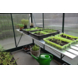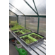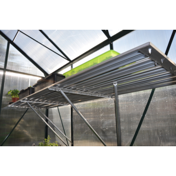 De blanke aluminium Alu Grower 150 vormt een universele kweektafel. Deze tafel heeft een vaste breedtemaat van 62,5 cm en een lengte van 150 cm. De constructie bestaat uit aluminium leggers (6 stuks), dragers en schoren (4 stuks). Een solide verbinding met het kasframe wordt gemaakt met behulp van RVS (hamerkop)bouten en moeren, standaardmaat M6. De kweektafel is in hoogte verstelbaar en kan op een ideale werkhoogte worden ingesteld. De Alu Grower 150 vormt een solide eenheid met de kas en helpt de kweekruimte optimaal te benutten. Deze tafel wordt over 2 staande glasroeden (kasframe) bevestigd en steekt daarmee zowel aan de linker- als rechterzijde voorbij de roede. De gevel- of lengtezijde dient daarom minimaal 3 ruiten breed of lang te zijn.
