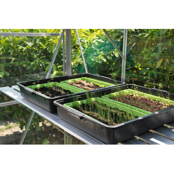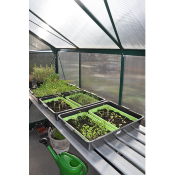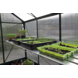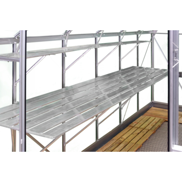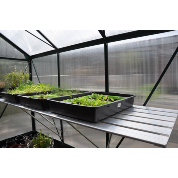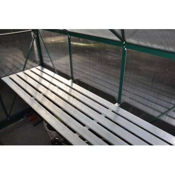 Deze blanke aluminium Alu Grower 200 vormt een universele kweektafel en is leverbaar in diverse maatvoeringen. Deze tafel heeft een vaste breedtemaat van 62,5 cm en een lengte van 200 cm. De constructie bestaat uit aluminium leggers (6 stuks), dragers en schoren (5 stuks). Een solide verbinding met het kasframe wordt gemaakt met behulp van RVS (hamerkop)bouten en moeren, standaardmaat M6. De kweektafel is in hoogte verstelbaar en kan op een ideale werkhoogte worden ingesteld. De Alu Grower 200 vormt een solide eenheid met de kas en helpt de kweekruimte optimaal te benutten. Deze tafel wordt over 3 staande glasroeden (kasframe) bevestigd en steekt daarmee zowel aan de linker- als rechterzijde voorbij de roede. De gevel- of lengtezijde dient daarom minimaal 4 ruiten breed of lang te zijn.