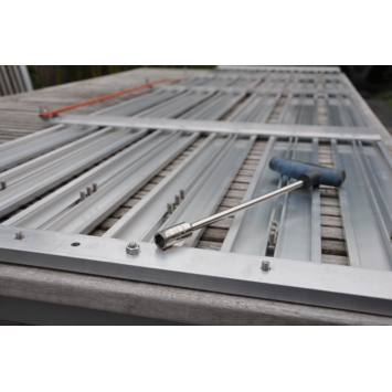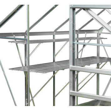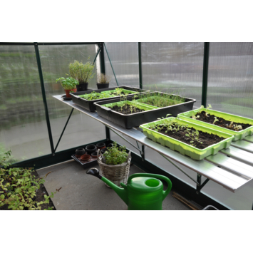 Deze blanke aluminium Alu Grower 250 vormt een universele kweektafel en is leverbaar in diverse maatvoeringen. Deze tafel heeft een vaste breedtemaat van 62,5 cm en een lengte van 250 cm. De constructie bestaat uit aluminium leggers (6 stuks), dragers en schoren (6 stuks). Een solide verbinding met het kasframe wordt gemaakt met behulp van RVS (hamerkop)bouten en moeren, standaardmaat M6. De kweektafel is in hoogte verstelbaar en kan op een ideale werkhoogte worden ingesteld. De Alu Grower 250 vormt een solide eenheid met de kas en helpt de kweekruimte optimaal te benutten. Deze tafel wordt over 4 staande glasroeden (kasframe) bevestigd en steekt daarmee zowel aan de linker- als rechterzijde voorbij de roede. De gevel- of lengtezijde dient daarom minimaal 5 ruiten breed of lang te zijn.