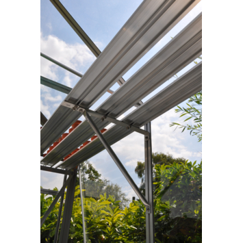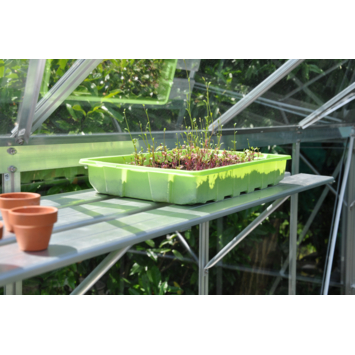 Deze blanke aluminium Alu Sower 250 vormt een solide kweekschap en is universeel toepasbaar in zeer veel kasmodellen. Het schap heeft een breedte van 32,5 cm en een lengte van 250 cm. De constructie bestaat uit aluminium leggers (3 stuks), dragers en schoren (4 stuks). Een solide verbinding met het kasframe wordt gemaakt met behulp van RVS (hamerkop)bouten en moeren, standaardmaat M6. Het schap is in hoogte instelbaar waardoor een ideale werkhouding kan worden gerealiseerd. Met behulp van dit schap kan de ruimte in de kas optimaal worden benut. Het schap wordt over 2 staande glasroeden (kasframe) bevestigd en steekt daarmee zowel aan de linker- als rechterzijde voorbij de roede. De gevel- of lengtezijde dient daarom minimaal 3 ruiten breed of lang te zijn.