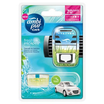 De Ambi Pur geurverspreider 'Waterfall' verspreidt een heerlijke geur tijdens het autorijden. Deze luchtverfrisser die speciaal gemaakt is voor in de auto, zorgt ervoor dat je auto altijd fris ruikt. De geurverspreider zuivert de autolucht met behulp van een membraantechnologie. Zo reis je comfortabel, zonder last te krijgen van een onaangename autogeur. De Ambi Pur Geurverspreider 'Waterfall' is onderdeel van de uitgebreide Ambi Pur-lijn met verschillende geuren. Je bevestigt de kleine luchtverfrisser met een clip op het ventilatierooster, zodat deze niet in de weg zit. Kortom, met de Ambi Pur Geurverspreider 'Waterfall' ga je wekenlang in een fris ruikende auto de weg op.