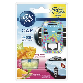 De Ambi Pur Auto geurverspreider 'Fruity' verspreidt een heerlijke geur tijdens het autorijden. Deze luchtverfrisser die speciaal gemaakt is voor in de auto, zorgt ervoor dat je auto altijd fris ruikt. De geurverspreider zuivert de autolucht met behulp van een membraantechnologie. Zo reis je comfortabel, zonder last te krijgen van een onaangename autogeur. De Ambi Pur Geurverspreider 'Fruity' is onderdeel van de uitgebreide Ambi Pur-lijn met verschillende geuren. Je bevestigt de kleine luchtverfrisser met een clip op het ventilatierooster, zodat deze niet in de weg zit. Kortom, met de Ambi Pur Geurverspreider 'Fruity' ga je wekenlang in een fris ruikende auto de weg op.