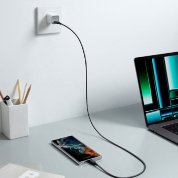 De kabel is 1 meter lang en geeft voldoende bewegingsruimte zonder dat hij in de weg zit. De buitenkant is gemaakt van dubbel gevlochten nylon, waardoor de kans op scheuren of breuk kleiner wordt, zelfs bij vaak buigen of oprollen. Dankzij een capaciteit tot 60 watt is de kabel geschikt voor verschillende USB-C apparaten en blijft hij betrouwbaar in gebruik.