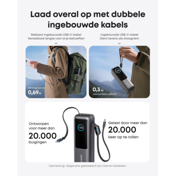 - Twee ingebouwde USB-C kabels van 70 cm en 30 cm