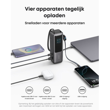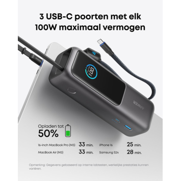 De Anker Powerbank snelladen 25.000 mAh (165W) is een krachtige externe accu waarmee je meerdere apparaten tegelijk van stroom voorziet. Met drie USB-C-poorten die elk tot 100 watt kunnen leveren, laad je zonder vertraging laptops, tablets en telefoons tegelijk op. De totale capaciteit van 25.000 mAh geeft je onderweg genoeg energie om apparaten meerdere keren volledig op te laden. Dankzij 100W snelladen is de powerbank zelf in twintig minuten alweer voor 30% gevuld, zodat je snel verder kunt.