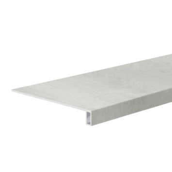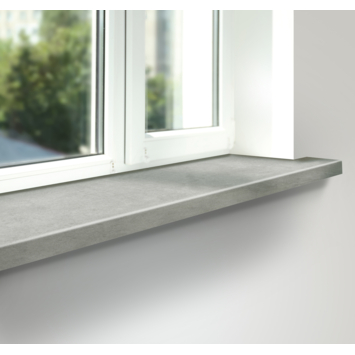 Mooie vensterbank van Aquastep in betongrijs, makkelijk op maat te zagen met een invalzaag. De kantenband van het merk Cando past er goed bij om de vensterbank af te werken, indien de kantenband van Aquastep niet te krijgen is.