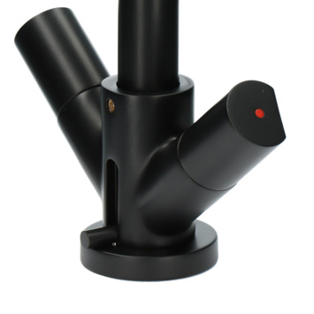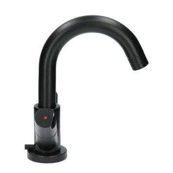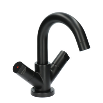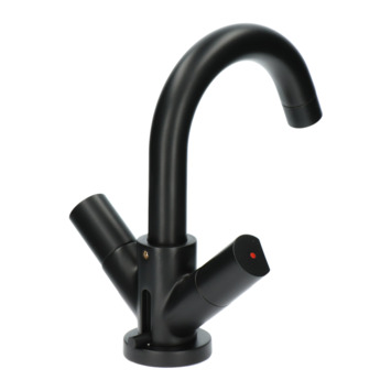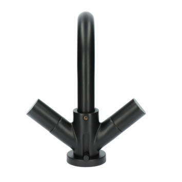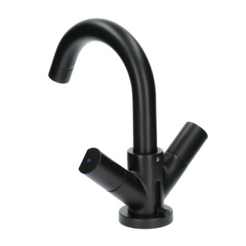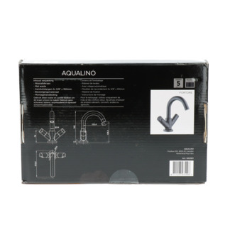 De Aqualino Fortore 2-knops wastafelkraan met waste Zwart heeft een unieke vormgeving waarin strakke lijnen gecombineerd worden met robuuste rondingen. De mat zwarte afwerking van de ronde c-vormige kraan geeft het geheel een krachtige uitstraling en past perfect in een landelijk of industrieel badkamerinterieur. De wat hogere uitloop in combinatie met de 360° draaibaarheid van de kraan geeft veel ruimte in de wastafel. Dat maakt het wassen van bijvoorbeeld haren eenvoudiger. Dankzij de waste inrichting is de afvoerplug met een hendel aan de achterzijde van de kraan te bedienen. Met handen in te heet of vuil water om het afvoer open te zetten, is verleden tijd! Het afstellen van de waterstraal gebeurt nauwkeurig en soepel door de keramische schijven in de 2 draaiknoppen. Deze schijven vergen bovendien nauwelijks onderhoud. De kraan zelf wordt het best gereinigd met alleen water en een zachte doek. Kalk is makkelijk met de hand van de antikalkperlator af te vegen.