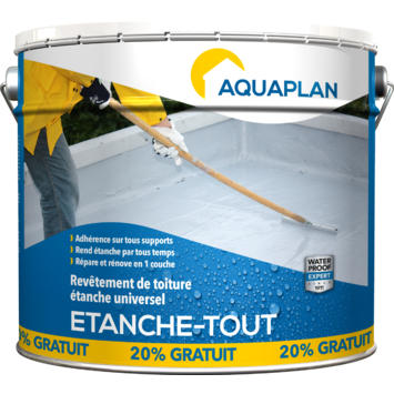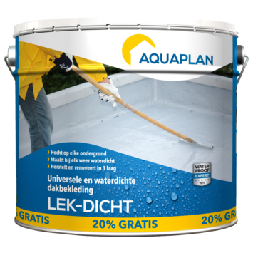Heb je een lek aan je plat dak en wil je deze snel herstellen en renoveren? Kies dan voor Aquaplan lek-dicht 12 liter. Deze waterdichte dakcoating zorgt voor een scheuroverbruggende, elastische en onmiddellijk waterdichte reparatielaag. Je bent snel klaar, want dit product is geschikt voor het repareren van vrijwel iedere ondergrond zonder deze voor te behandelen met een hechtlaag. Zelfs bij vochtige ondergronden hecht deze coating. De coating is lichtgrijs van kleur en zorgt hiermee voor UV-weerkaatsing en dus voor een koeler dak. Kortom: daken herstel je voortaan in een handomdraai met Aquaplan lek-dicht.