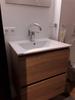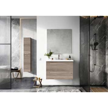 De Sienna badmeubelset melamine hout 60 cm is een modern uitgevoerde hangende set. Dankzij het hangende design creëer je een ruimtelijke look in jouw badkamer. Bovendien kun je hierdoor eenvoudig rondom het meubel schoonmaken. Het melamine hout uitgevoerde badkamermeubel is voorzien van 2 soft close laden en een keramische wastafel. Daarnaast bestaat de set uit een losse spiegel (60 cm breed en 65 cm hoog). De set is voorzien van stijlvolle verchroomde aluminium grepen, wat zorgt voor een strak en modern uiterlijk. De set wordt flatpacked geleverd en is eenvoudig te installeren met de meegeleverde bevestigingsmaterialen. OF geef het meubel een industriële look met de zwarte stalen frames (art. 137942). Formaat meubel: 596x530 mm. Exclusief wastafelkraan.