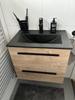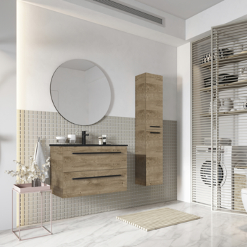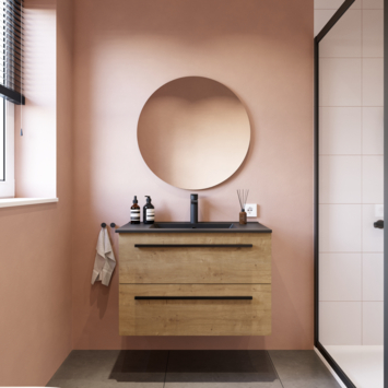 Badkamermeubelserie Stella is een eigentijds meubel. Door de mat zwarte wastafel, de mat zwart grepen en ronde spiegel is heeft dit meubel een chique uitstraling voor een betaalbare prijs.