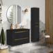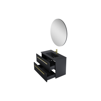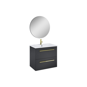 Badkamermeubelserie Stella is een eigentijds meubel. Door de mat zwarte wastafel, de messing grepen en ronde spiegel is heeft dit meubel een chique uitstraling voor een betaalbare prijs.