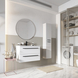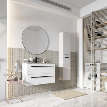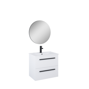 Badkamermeubelserie Stella is een eigentijds meubel. Door de mat witte wastafel, de mat zwart grepen en ronde spiegel is heeft dit meubel een chique uitstraling voor een betaalbare prijs.