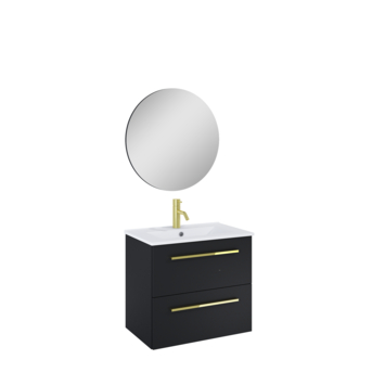 Badkamermeubelserie Stella is een eigentijds meubel. Door de mat witte wastafel, de messing grepen en ronde spiegel is heeft dit meubel een chique uitstraling voor een betaalbare prijs.