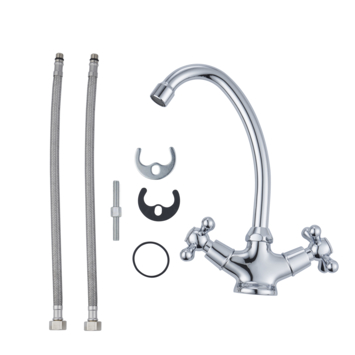 Deze Atlantic keukenkraan Louise 2-knops met C-uitloop Chroom is onderdeel van de Atlantic Louise kranenserie. Kenmerkend voor de Louise-serie zijn de klassieke bedieningsknoppen. Je kunt in deze serie kiezen tussen tweeknops mengkranen of thermostatische kranen. Dankzij de fabrieksgarantie van 5 jaar ben je verzekerd van een goede aankoop. Deze Louise keukenkraan heeft een hoge draaibare uitloop. Door de keramische schijven in de kraan is het makkelijk om de kraan goed dicht te draaien. Een ander groot voordeel is dat kranen met keramische schijven nauwelijks onderhoud vergen. De Atlantic kranen worden geleverd inclusief aansluitmateriaal. De aansluitmaten van de bijgevoegde flexibele slangen zijn 3/8".
