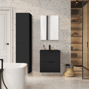 De Figo kolomkast in zwart geeft jouw badkamer een stoere, moderne uitstraling en zorgt voor extra opbergruimte zonder dat je vloeroppervlak inlevert. Met zijn hangende design en greeploze fronten creëer je een minimalistische look die perfect past bij hedendaagse interieurs. Dankzij de vier planken en push-to-open systeem berg je al je spullen netjes op en houd je alles binnen handbereik. Combineer de kast eenvoudig met Elena, Aisa of Raff meubels voor een harmonieus geheel. Inclusief bevestigingsmateriaal, dus je kunt direct aan de slag. Verkrijgbaar bij Karwei – maak jouw badkamer compleet met Figo. Combineer eenvoudig met Elena, Aisa en Raff voor een complete badkamer.
