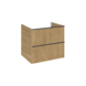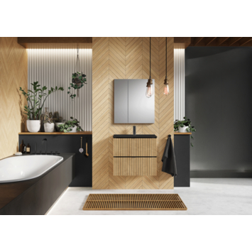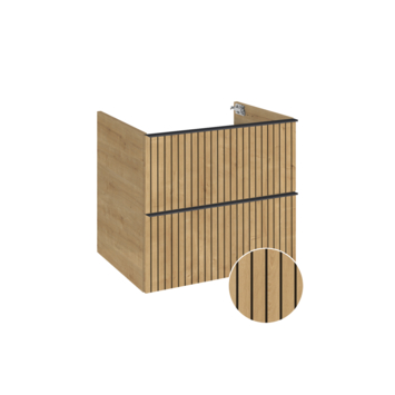 Het Orion badmeubel van 60 cm in geribbeld eik en zwart geeft je badkamer een moderne uitstraling met slimme opbergruimte. De twee softclose-lades met voelbare ribbelstructuur houden handdoeken en verzorgingsproducten netjes uit het zicht en overzichtelijk opgeborgen. De lange zwarte handgrepen over de volledige ladebreedte maken openen en sluiten soepel en zorgen voor een strak, verzorgd front. Het contrast tussen eikenhout en zwart maakt het meubel een echte eyecatcher die in elk interieur past. Kies zelf een bijpassende wastafel uit de Kyra- of Skappa-lijn en bepaal kleur en afwerking naar jouw smaak. Met een breedte van 60 cm, diepte van 46 cm en hoogte van 53 cm biedt het compacte meubel toch volop functionaliteit.